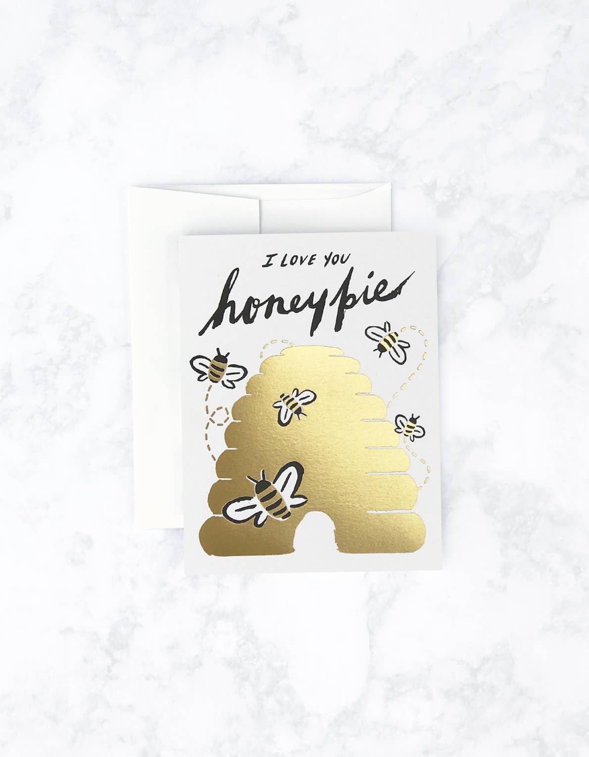 Busy bees swarm around a luxe gold-foil honey hive. A beautifully understated greeting for your honeypie.